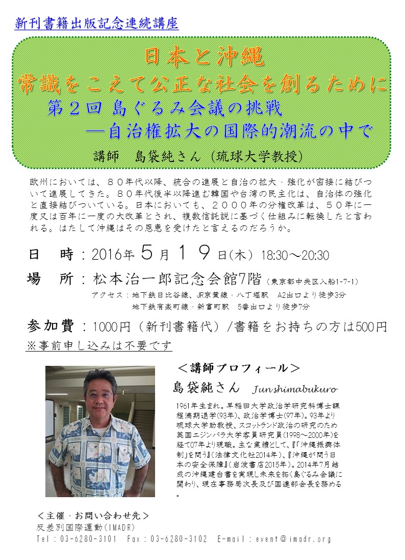 【イベント】第2回書籍出版記念講座「日本と沖縄 常識をこえて公正な社会を創るために」(5/19、東京)