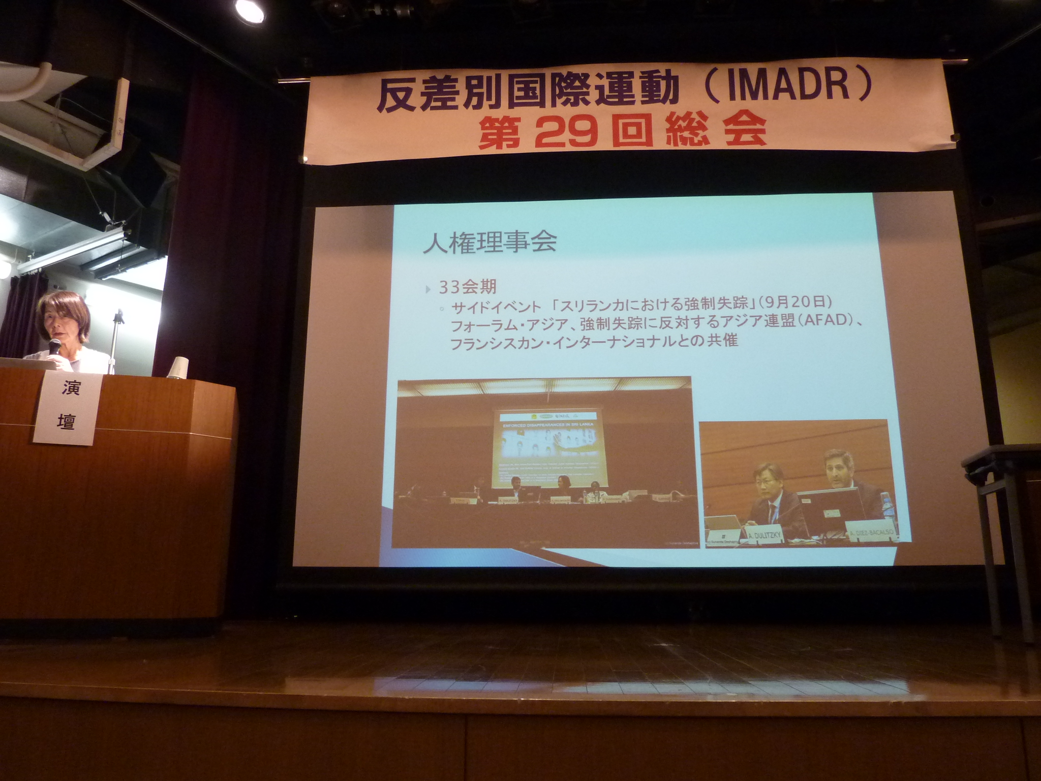 2017年6月9日、反差別国際運動(IMAR)は第29回総会を日比谷コンベンションホールで開催しました。総会では、2017年度も、人種差別撤廃とダリット・部落差別との闘いを中心に、国内、地域、国際レベルのさまざまNGOや機関と協力しながら、反差別の取り組みを続けていくことが確認されました。総会の記念講演として、「沖縄の自己決定権」をテーマに琉球新報の新垣毅記者に講演していただきました。沖縄が自らのことを決定する権利を奪われてきた過程を、歴史をたどりながら現在に至るまで、貴重な資料や写真とともに報告していただきました。続いて、北海道アイヌ協会副理事長の阿部ユポさんに「アイヌ民族の先住民族の権利」についてご報告いただきました。総会には120人の会員が集まりました。
