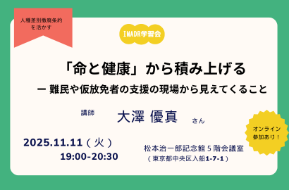 沖縄書籍講座1 2016.04.11 前へ 一覧 最近の記事 2025.10.15 イベント&キャンペーン IMADR学習会「命と健康」から積み上げる ー 難民や仮放免者の支援の現場から見えてくること 2025.10.15 イベント&キャンペーン 2025.09.24 ニュース 第6次男女共同参画基本計画案へのパブコメ提出 2025.09.24 ニュース 2025.09.12 イベント&キャンペーン スリランカ北部女性への自立応援プロジェクト ーご協力のお願い 2025.09.12 イベント&キャンペーン