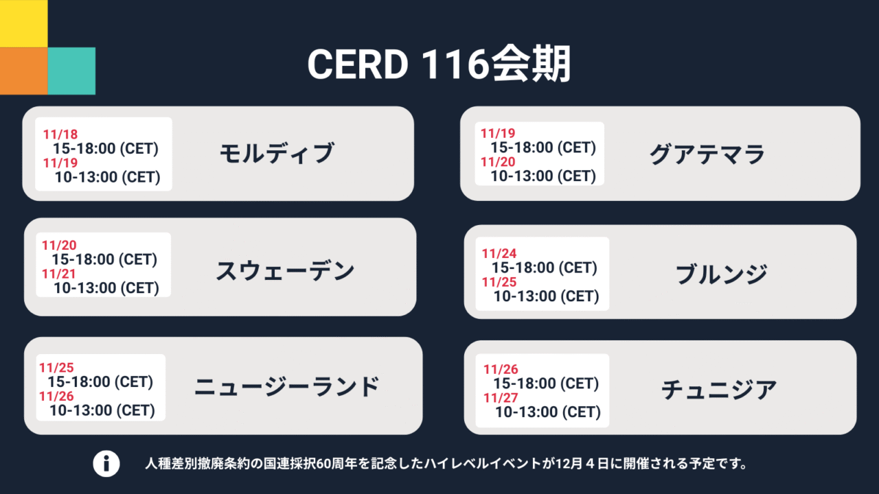 人種差別撤廃委員会(CERD)116会期が11月17日に始まりました(12月5日に終了予定)。会期中には、モルディブ、グアテマラ、スウェーデン、ブルンジ、ニュージーランド、チュニジアの政府報告書審査が行われます。