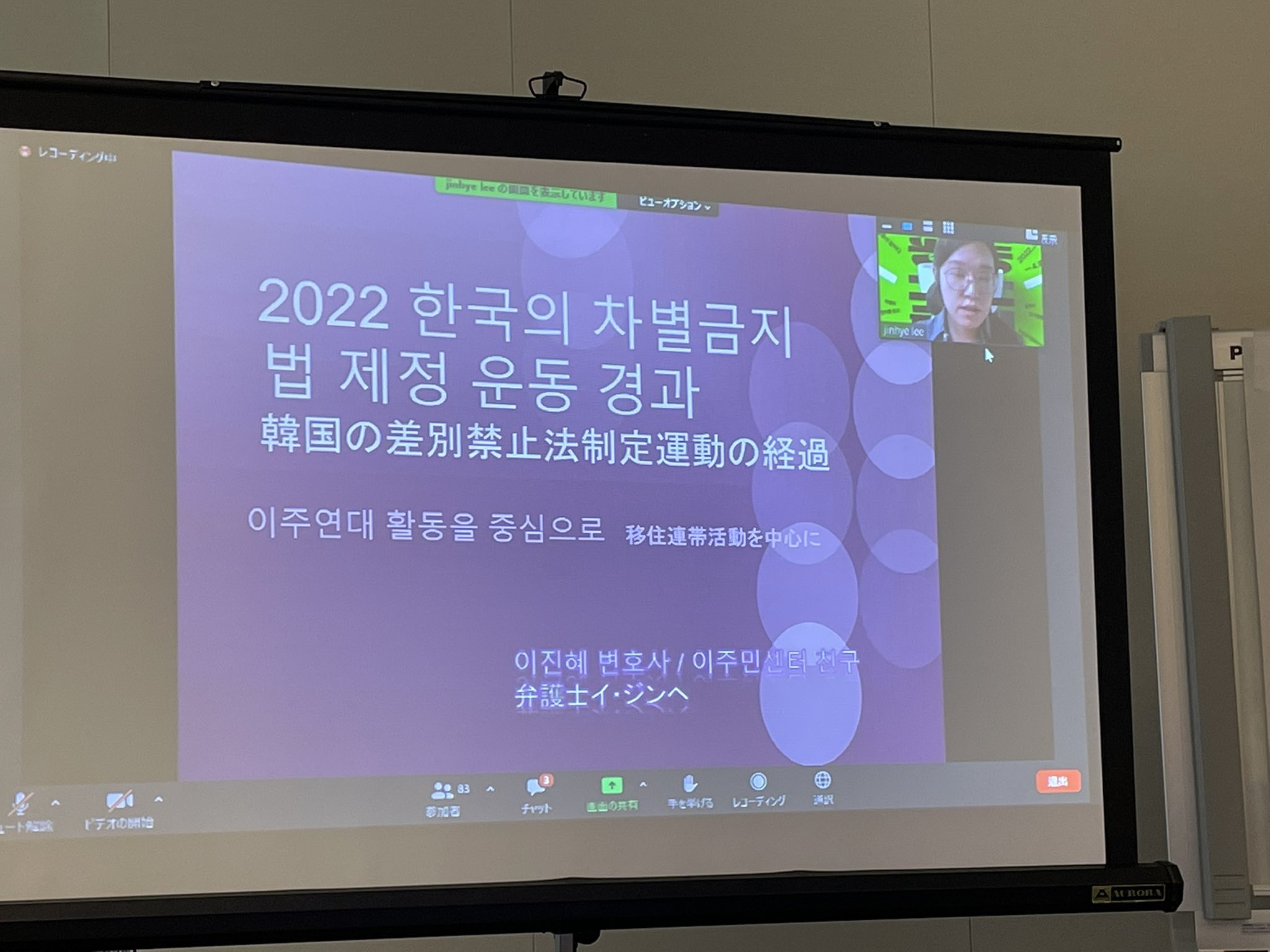 イ・ジンへ弁護士(移民センター”チング”事務局長)からは、韓国における差別禁止法制定の動きについて報告がありました。