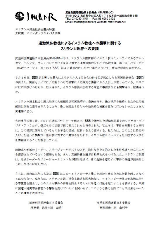 反差別国際運動日本委員会 (IMADR-JC)は6月27日、スリランカにおける過激派仏教徒によるイスラム教徒への襲撃事件に関して、スリランカ政府に積極的な対応を求める要請書を送りました。