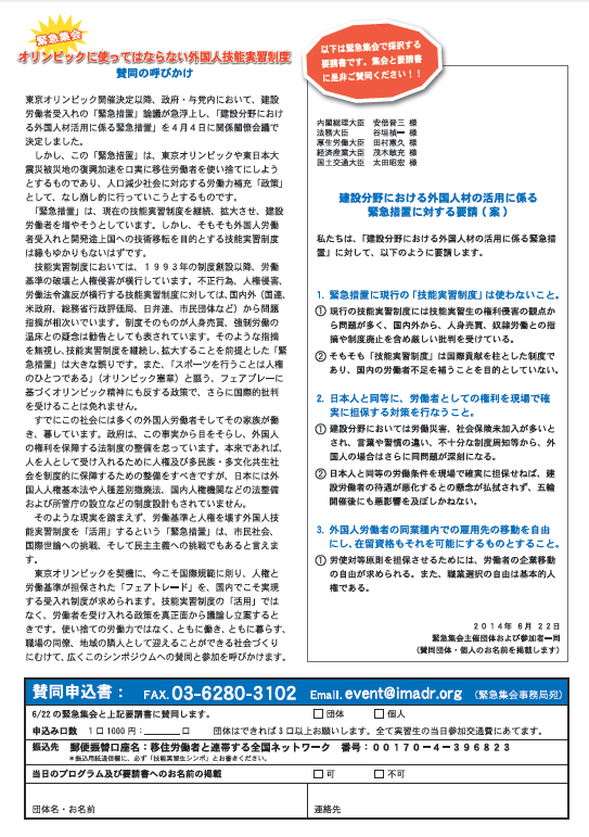 『オリンピックのために使ってはならない外国人技能実習制度』政府への要請書に是非ご賛同ください!